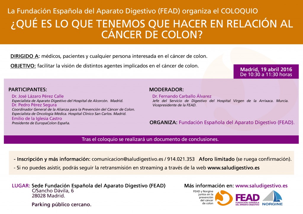 La Fundación Española del Aparato Digestivo (FEAD) está decididamente comprometida con la lucha contra el cáncer de colon, y en especial con su prevención y diagnóstico precoz. Con este fin desde la FEAD organizamos un coloquio que bajo el titulo ¿Qué es lo que tenemos que hacer en relación al cáncer de colon? pretende facilitar la visión de distintos agentes implicados en el cáncer de colon.