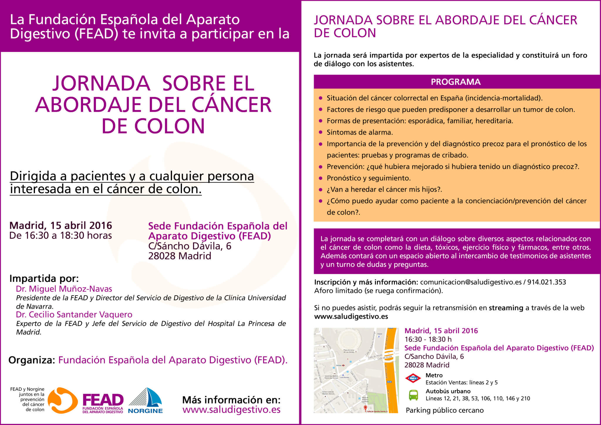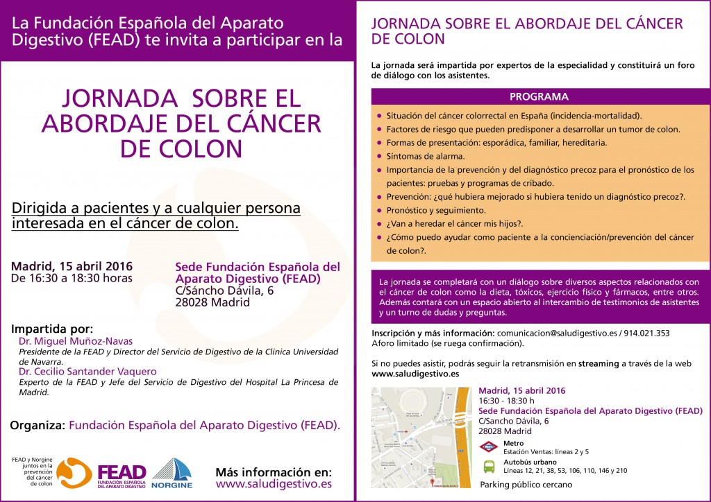 La Fundación Española del Aparato Digestivo (FEAD) está decididamente comprometida con la lucha contra el cáncer de colon, y en especial con su prevención y diagnostico precoz. Con este fin desde la FEAD organizamos una jornada sobre el abordaje del cáncer de colon el próximo 15 de abril a las 16:30 en la sede de la Fundación (Sáncho Dávila, 6, 28028, Madrid).